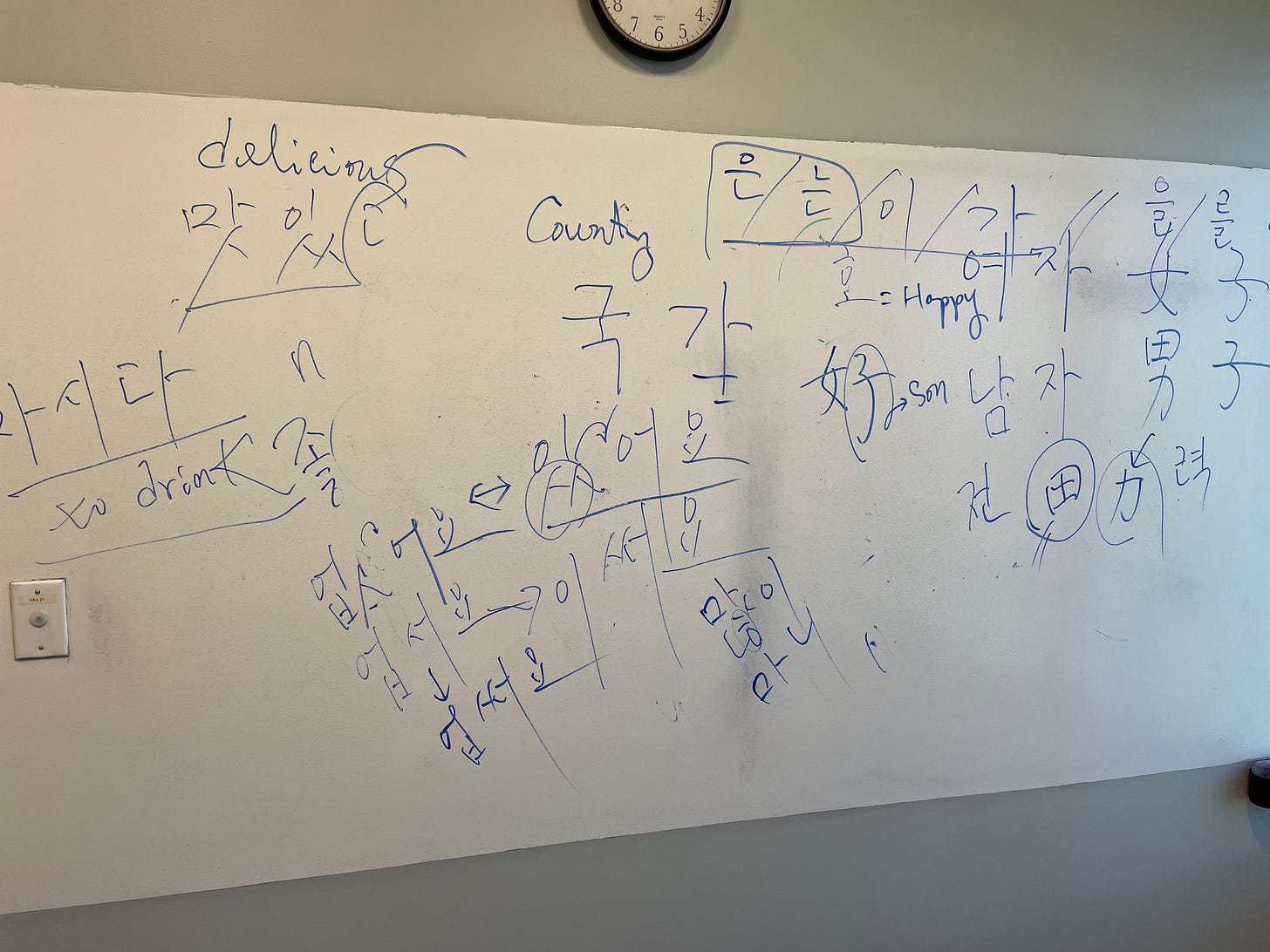 It only took a few days to get comfortable reading and writing the Korean alphabet (Hangul, 한글), and each day I’m getting faster and faster at reading out loud and catching all the sound change rules. Reading my instructor’s handwriting can sometimes be a challenge though…