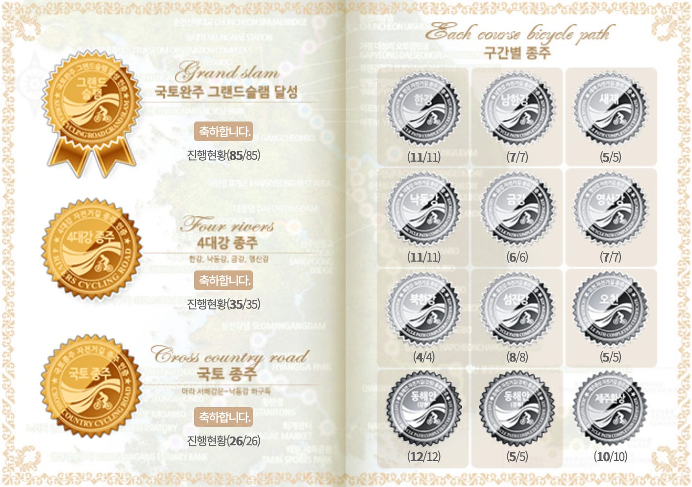 Before coming to Korea, I heard about Korea’s “bike passport” system from a previous Korea Olmsted Scholar. Basically, spread throughout South Korea’s many bike trails are stamp booths, and as you fill up a passport book with stamps, you earn special stamps, stickers, and eventually, up to three coveted bike touring medals.