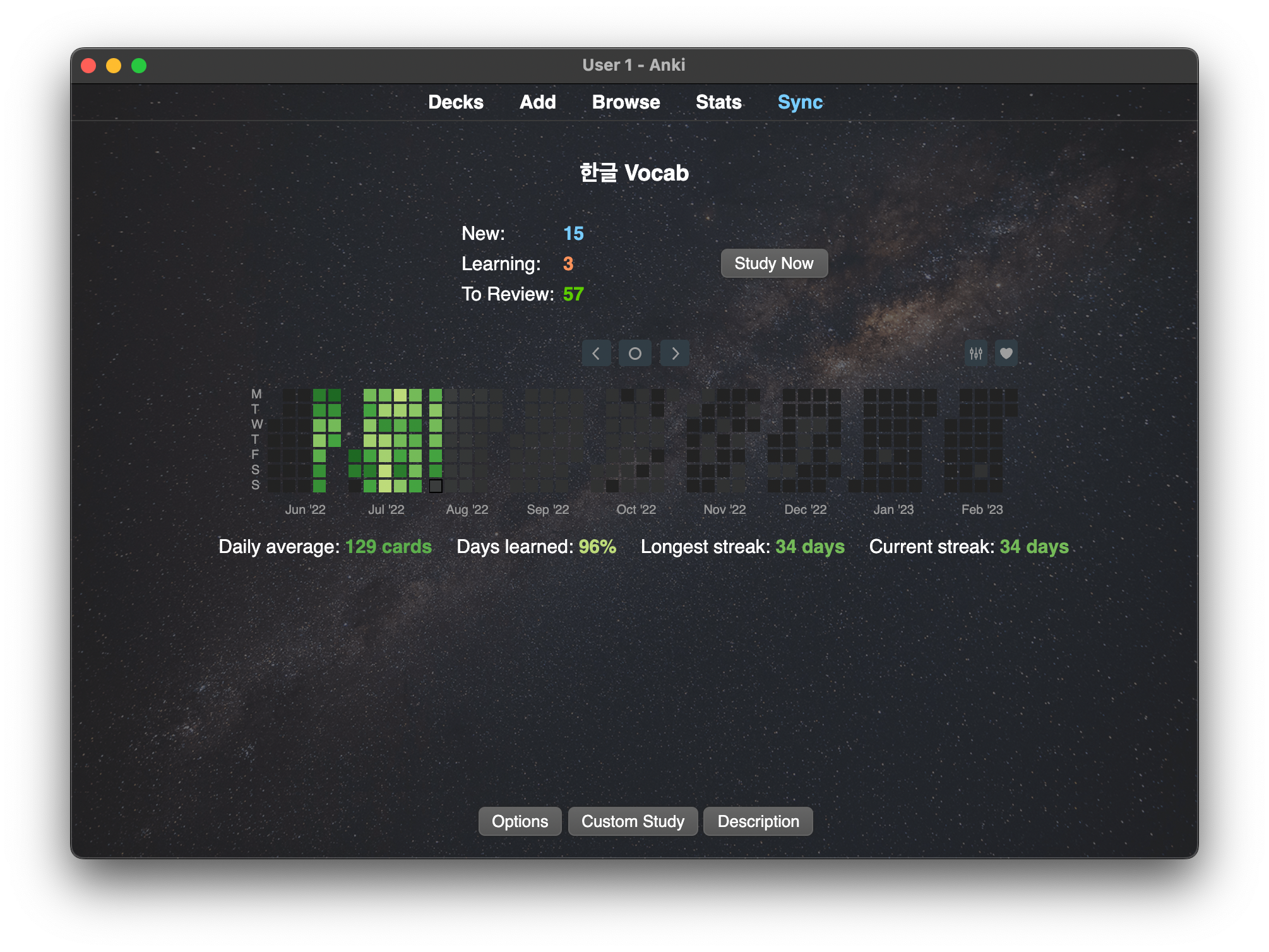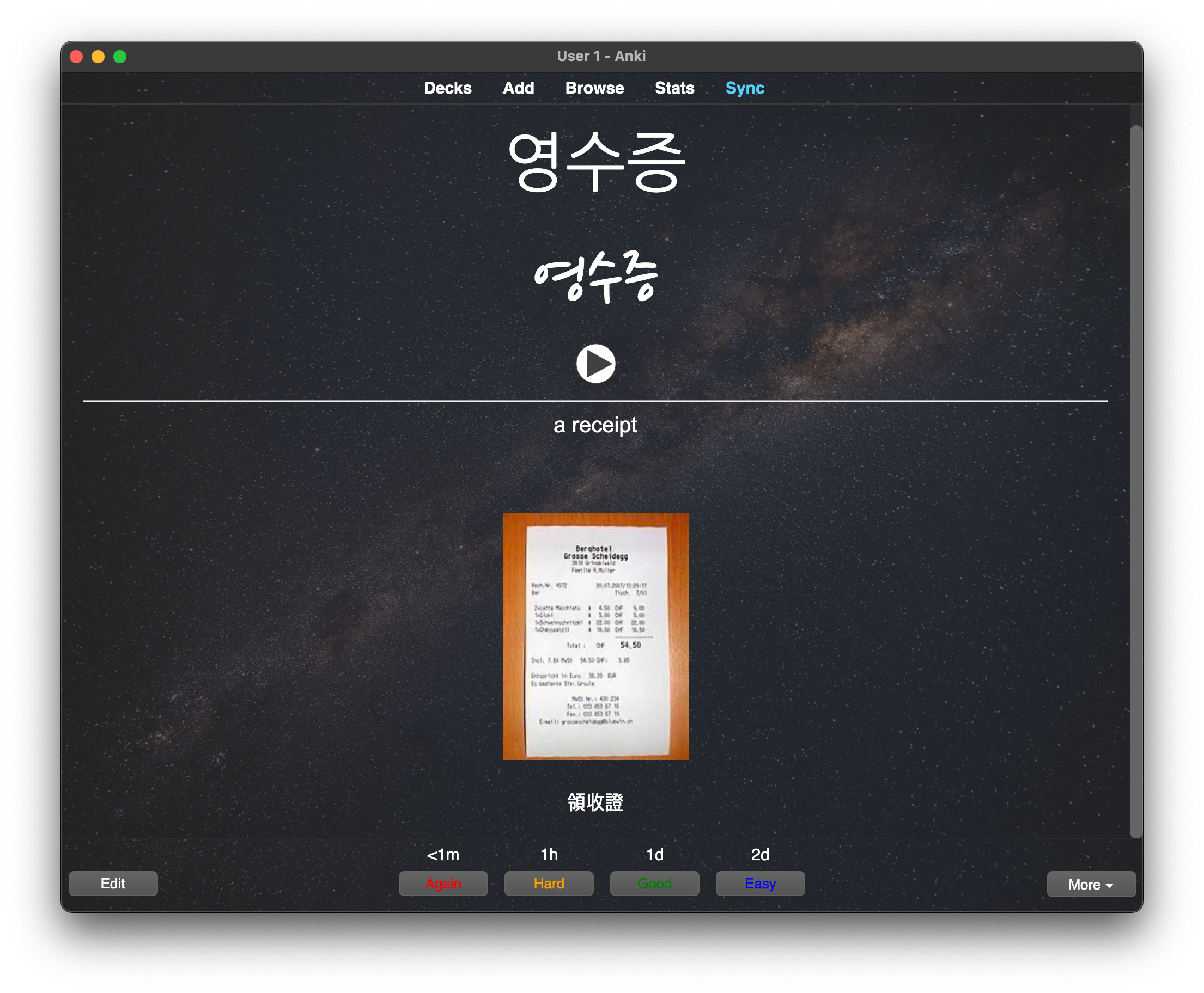 Below, I’ve included an example of what my cards look like. Anki is entirely customizable, so I’ve included information on the card that I find useful. On the front of the card, I display the word written in a typed font and a handwritten font while an audio recording of the word plays automatically (automatically generated using Naver’s translator). Once I either recall the word or decide I can’t remember it, I hit the spacebar and the translation, a picture, and the Hanja (Chinese characters it’s based off of) are displayed below. I rate the card as “Again” if I straight up had no clue, “Hard” if I just couldn’t remember but it’s in my head somewhere," “Good” if I knew it but had to think about it, and “Easy” if I don’t need to see that card for a long time. With practice, I can knock out hundreds of cards pretty quickly in the morning to be ready for the day.