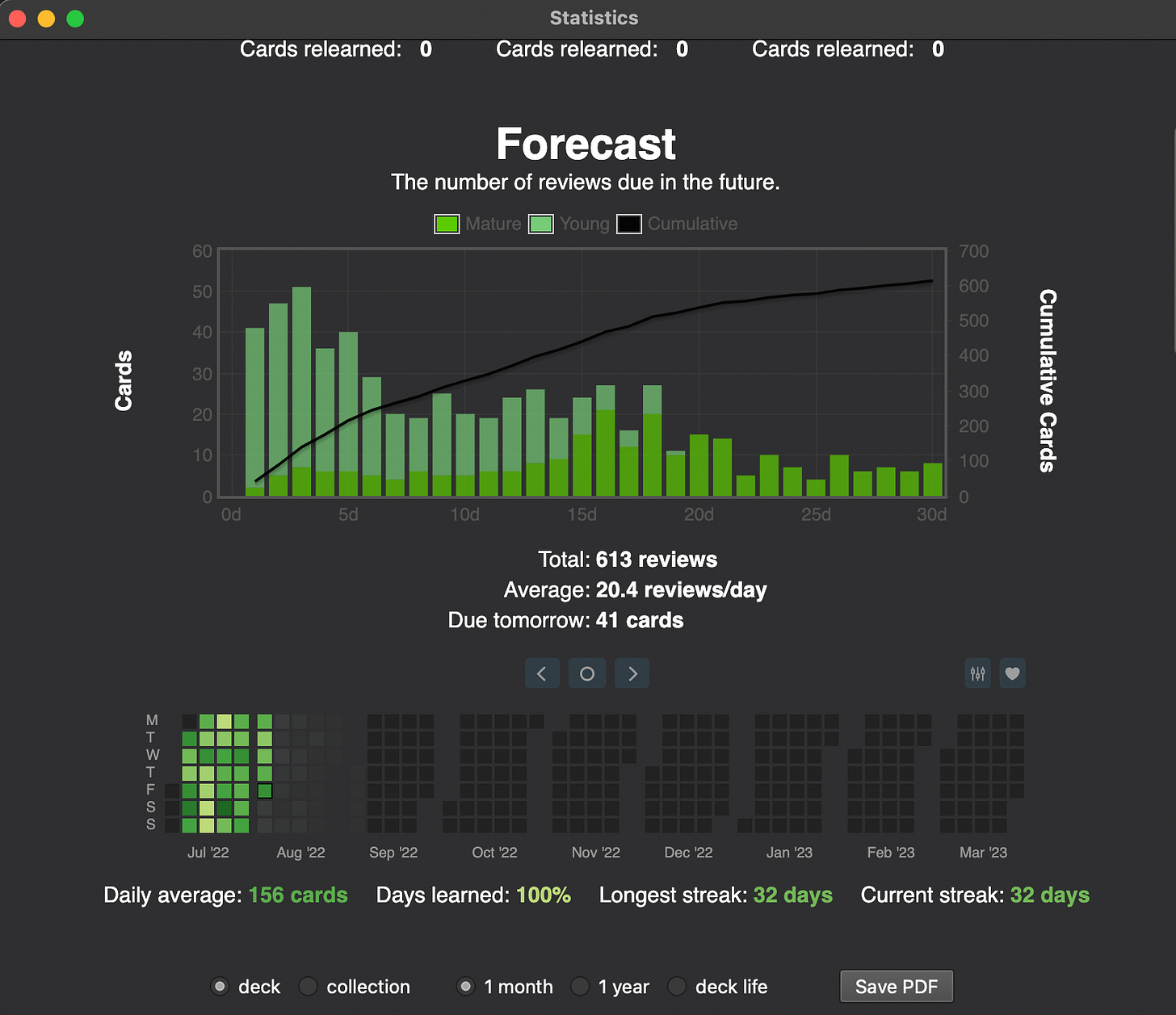Anki also collects a lot of data and you can view whatever is useful for tweaking the algorithm or to view your progress. The screenshot below shows an example of some statistics over a month-long period.