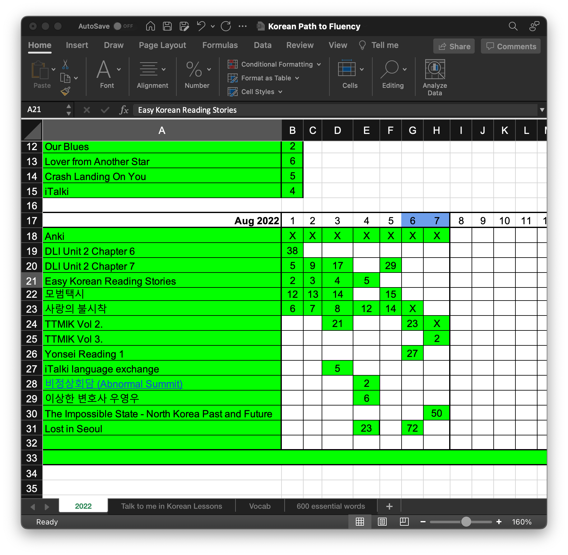 In my tracker, I’m keeping track of which lesson I’ve completed, what page I’m on in a book, or what episode I’m on in a drama or variety show. I’ve just started this resource tracking, so I’m curious to see what this looks like at the end of a year! I’ll also start including reviews of resources after I’ve finished them so I can hand off this spreadsheet to the next Olmsted scholar headed to Korea.