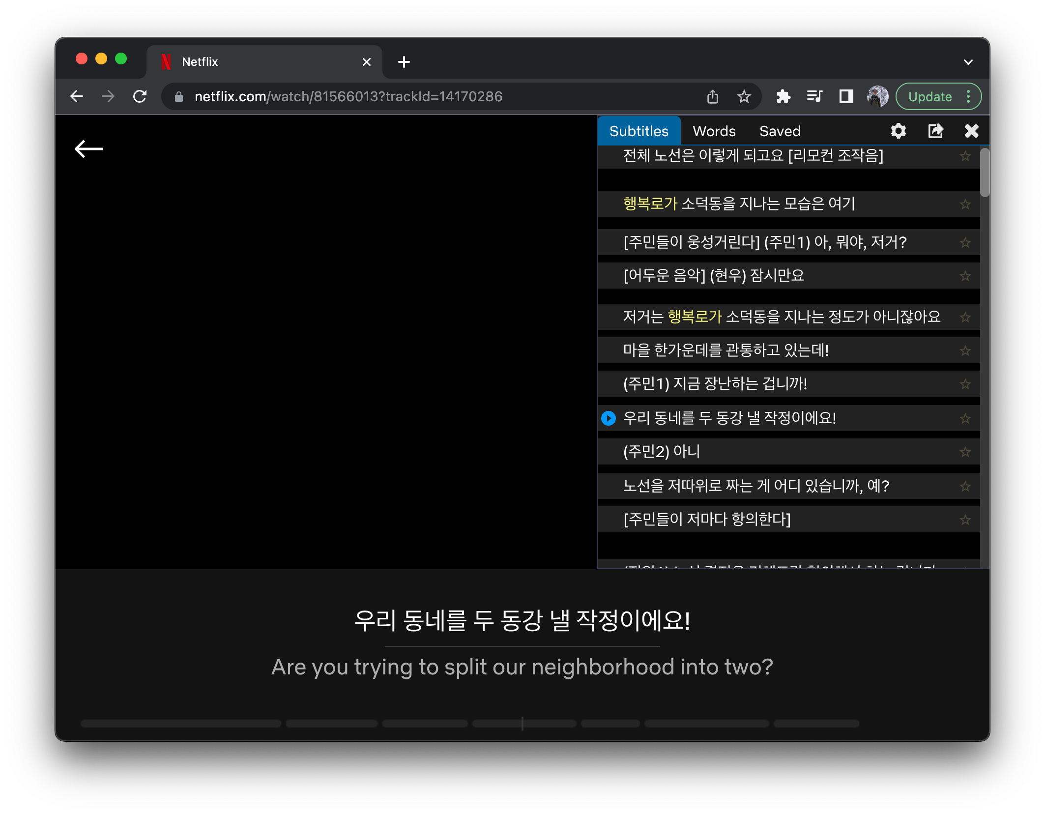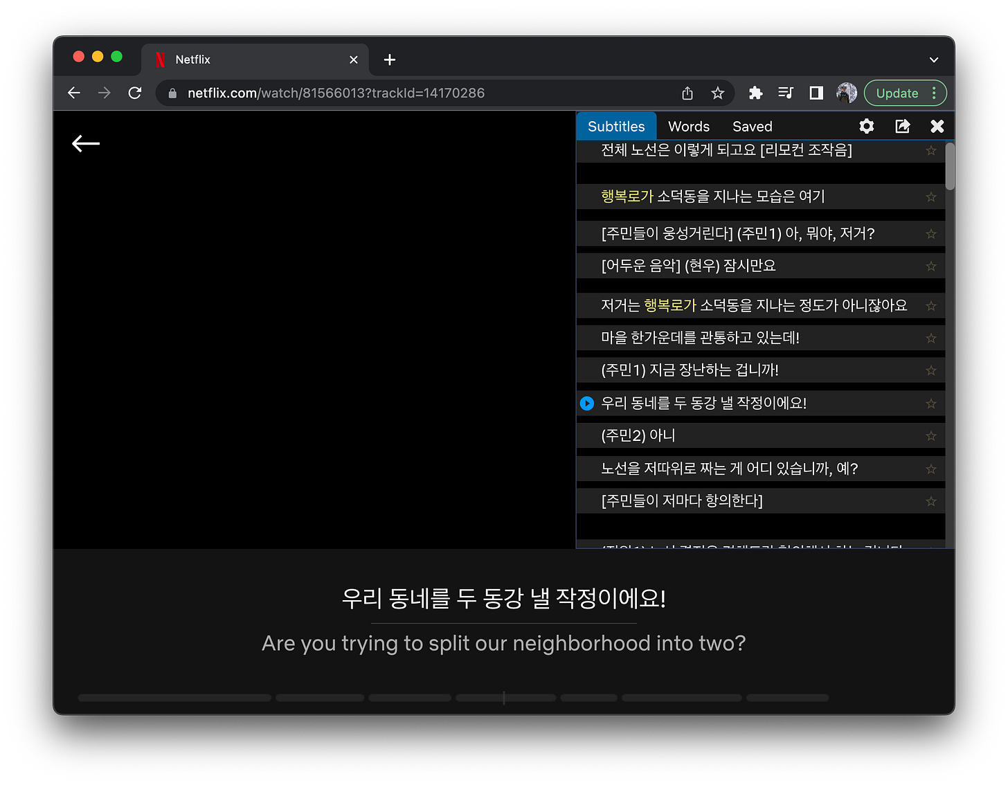 The most useful resource for Korean has been Netflix while using the Language Reactor plugin. Below, you can see what this looks like (Netflix blocks screenshots unfortunately, but you get the gist). I’ll have the show playing while the script in Korean is displayed on the right hand side. Below the video player, the subtitles are displayed in Korean and in English. The most useful feature of this plugin is the script on the right hand side - when I want to listen to a phrase again, I just click the play button next to that phrase, and it’ll scrub to the exact moment and repeat over and over again so I can mimic the pronunciation or just pick out the word I’m interested in. Mousing over a word in the script also translates the word, and you can easily save words and even export them to an Anki deck. I absolutely love this plugin!